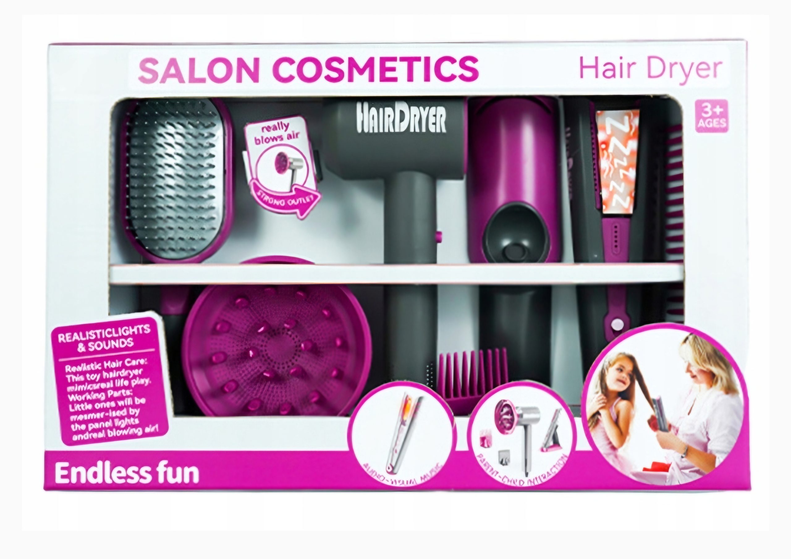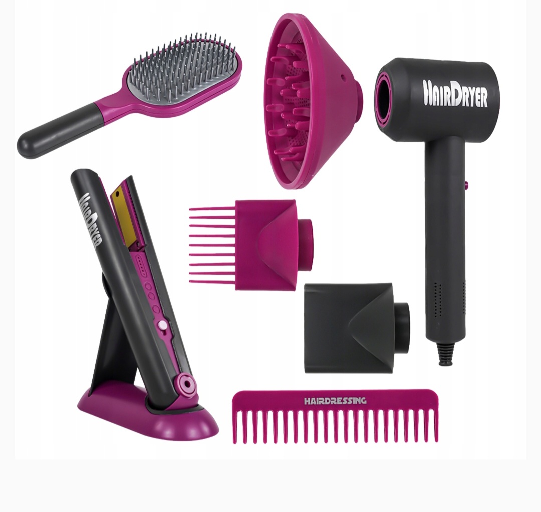 Postani mala frizerka! Ovaj set za uređivanje kose sadrži fen, stalak za peglu, peglu za kosu, četku, češljić i nastavak za fen. Idealno za igru uloga, razvija maštu i kreativnost, a male frizerke mogu satima uređivati svoje lutke i prijatelje. Fen za kosu proizvodi zvuk nalik pravom fenu z kosu,što djevojčicama daje dojam prave frizerke. Pegla za kosu daje svijetlost nalik također na pravu peglu. Uređaji rade na baterije.