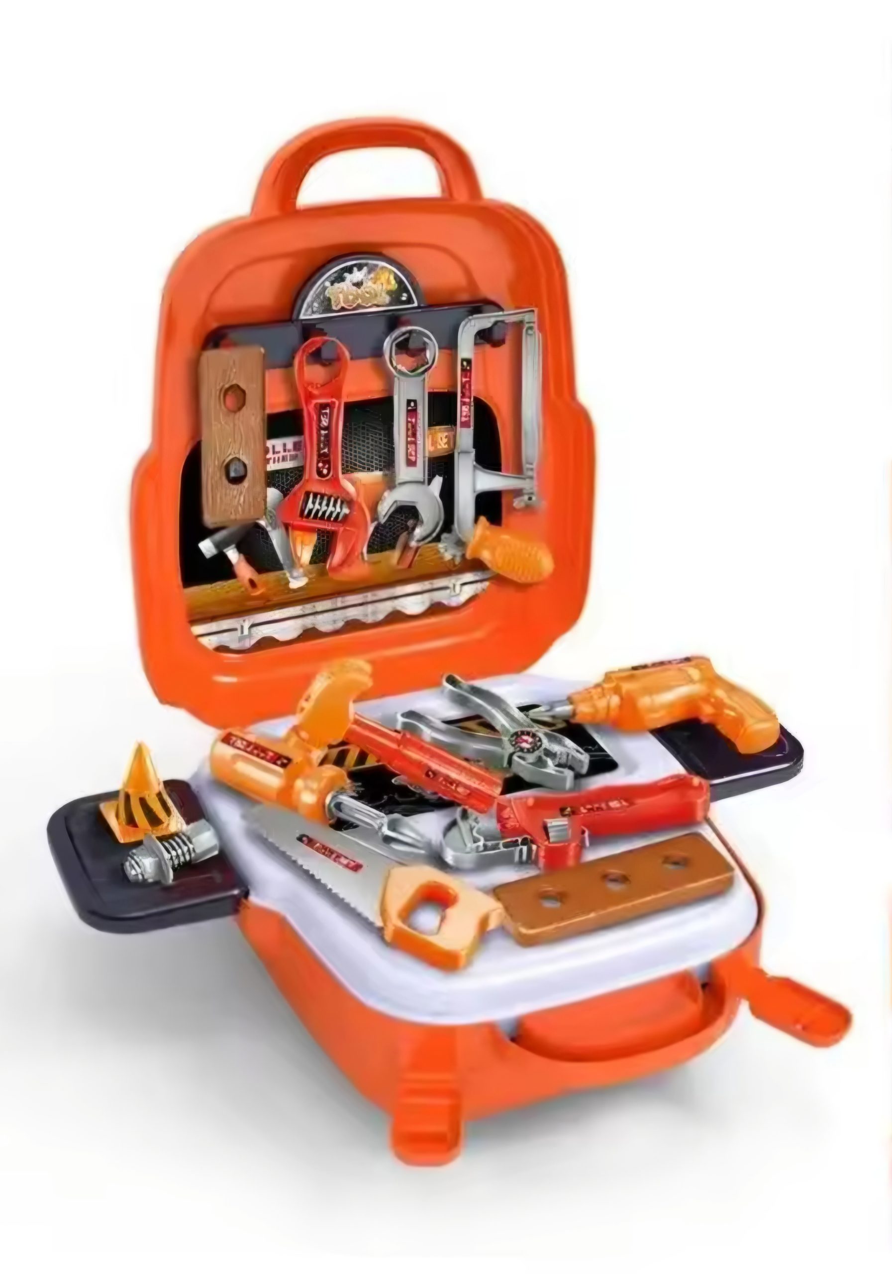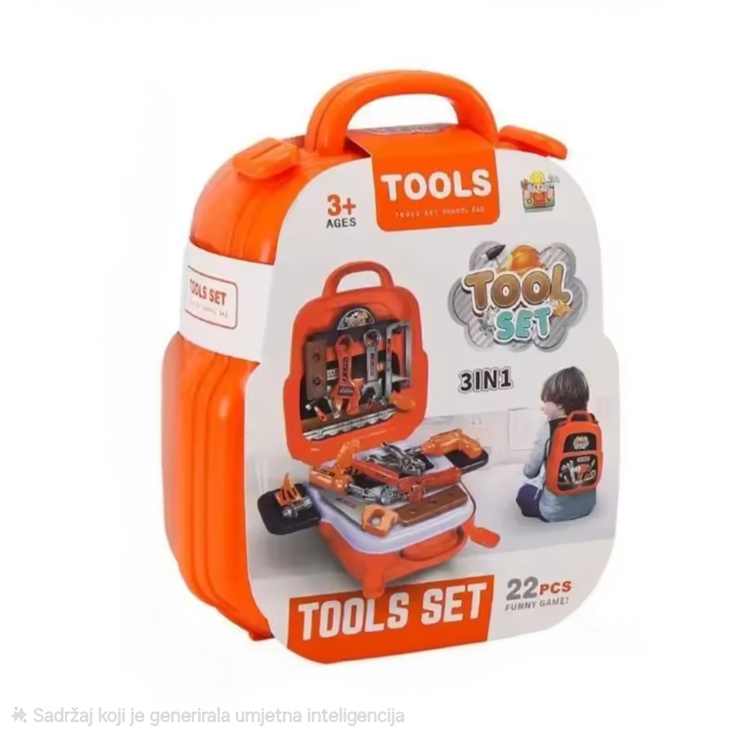 Ovaj set sadrži 22 komada različitog alata. Može biti kao kovčeg za nositi u ruci ili ga možete pretvoriti u ruksak za lakše nošenje za igru na otvorenom, a za boravak u kući može se složiti da bude mali stol za alat. 3 u 1 set.